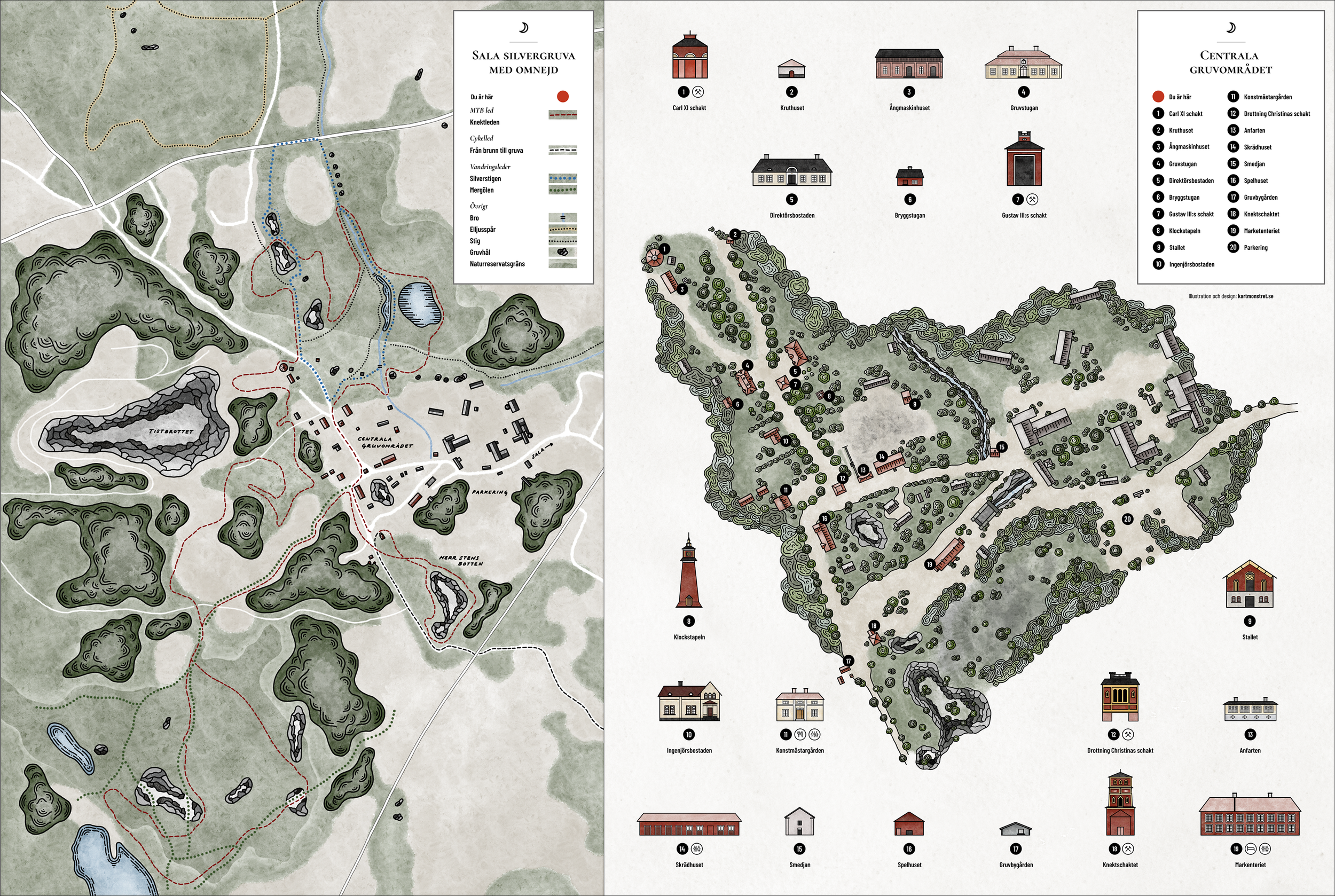 Utifrån ett nära samarbete med projektledare på Sala Silvergruva började jag kartlägga området med hjälp av Google Maps, Google Earth och Lantmäteriet. Därefter gjorde jag många resor till gruvan där jag dokumenterade byggnader, schakt och andra visuellt viktiga landmärken. Med riktiga kartor som utgångspunkt började jag rita kartorna för hand i ritverktyget Procreate. Efter flera feedback-loopar satte jag ihop den slutliga designen i Figma och InDesign.